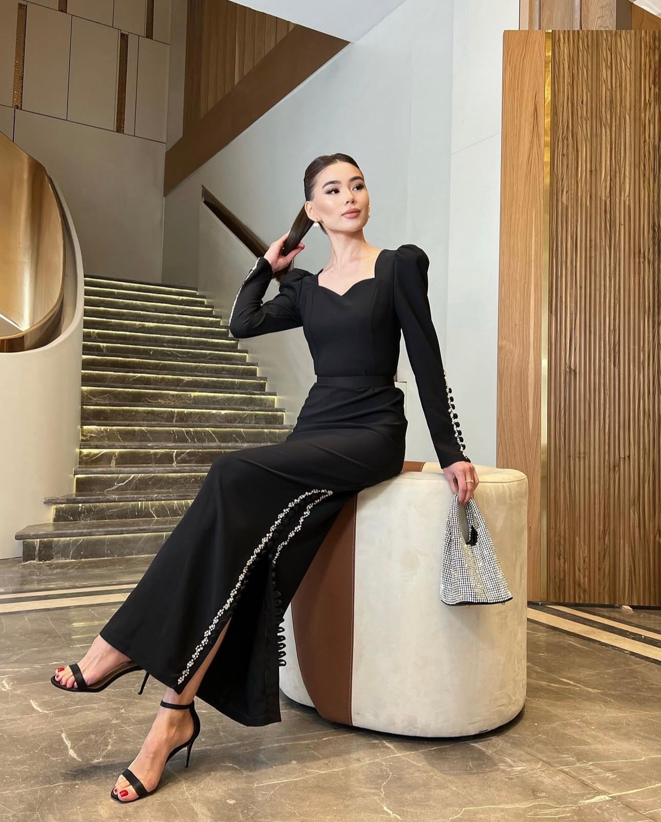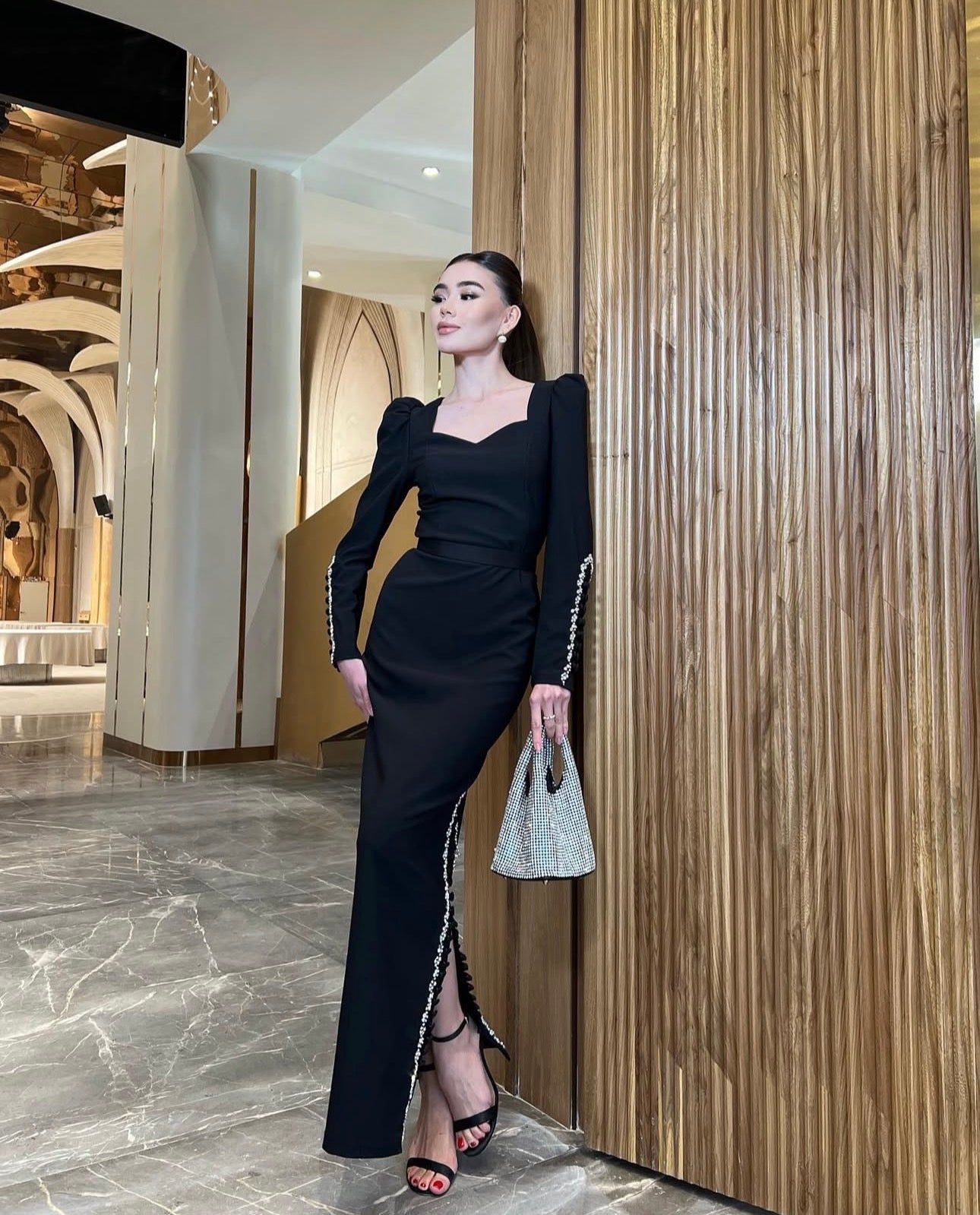 This is a chic long black maxi dress with a sweetheart neckline and a tailored fit. It features a long side slit detailed with silver beading or pearls, and coordinating beading along the long sleeves, achieving an elegant, high-impact evening look.