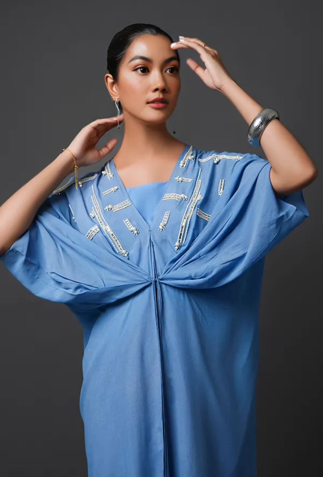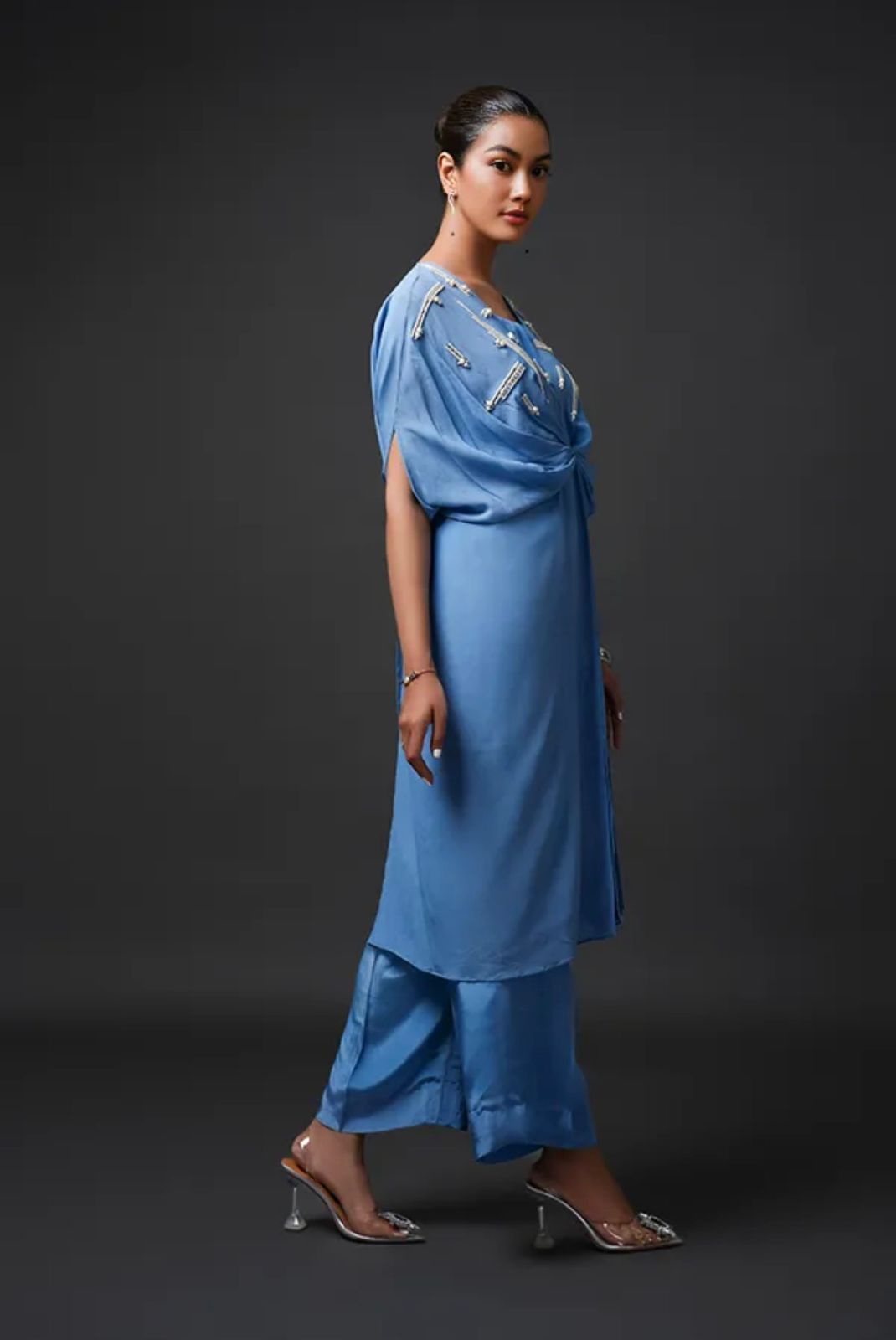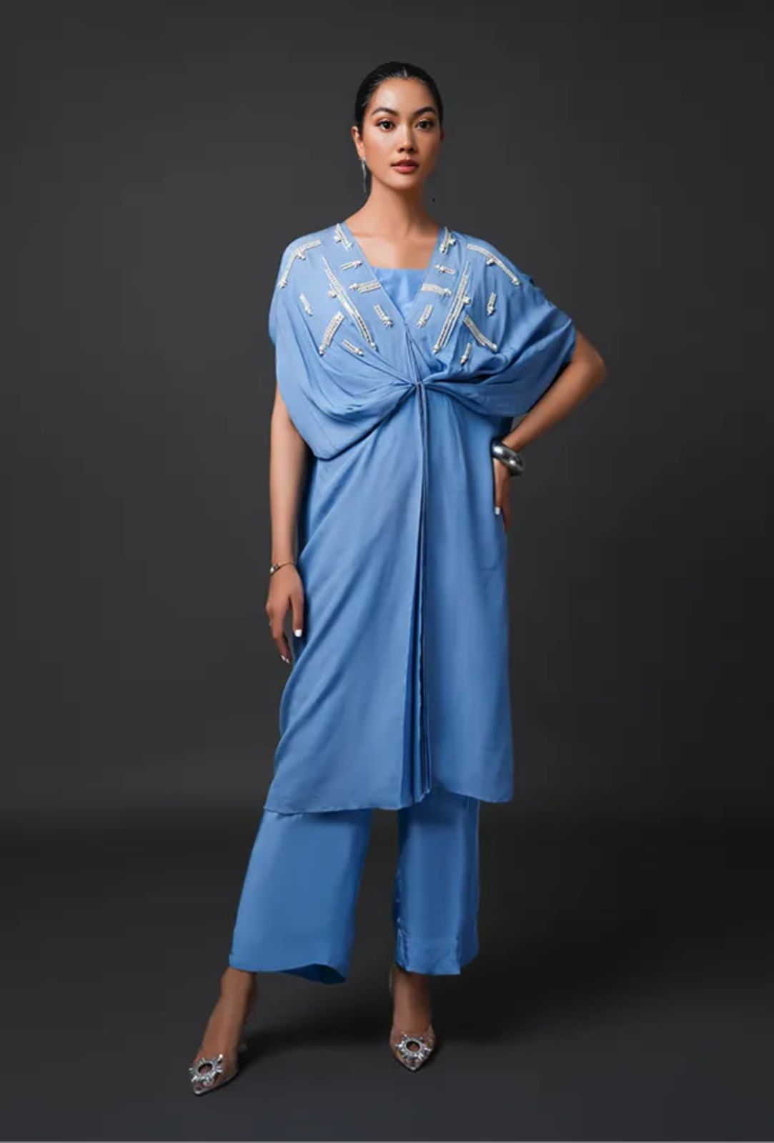An elegant draped co-ord set in a serene azure blue. The ensemble features a fluid overlay top with intricate bead and sequin embellishments across the shoulders, creating a graceful shimmer. The knot-front drape flows effortlessly over straight-cut trousers, offering a blend of relaxed sophistication and modern glamour — ideal for festive soirées or statement evening wear.
