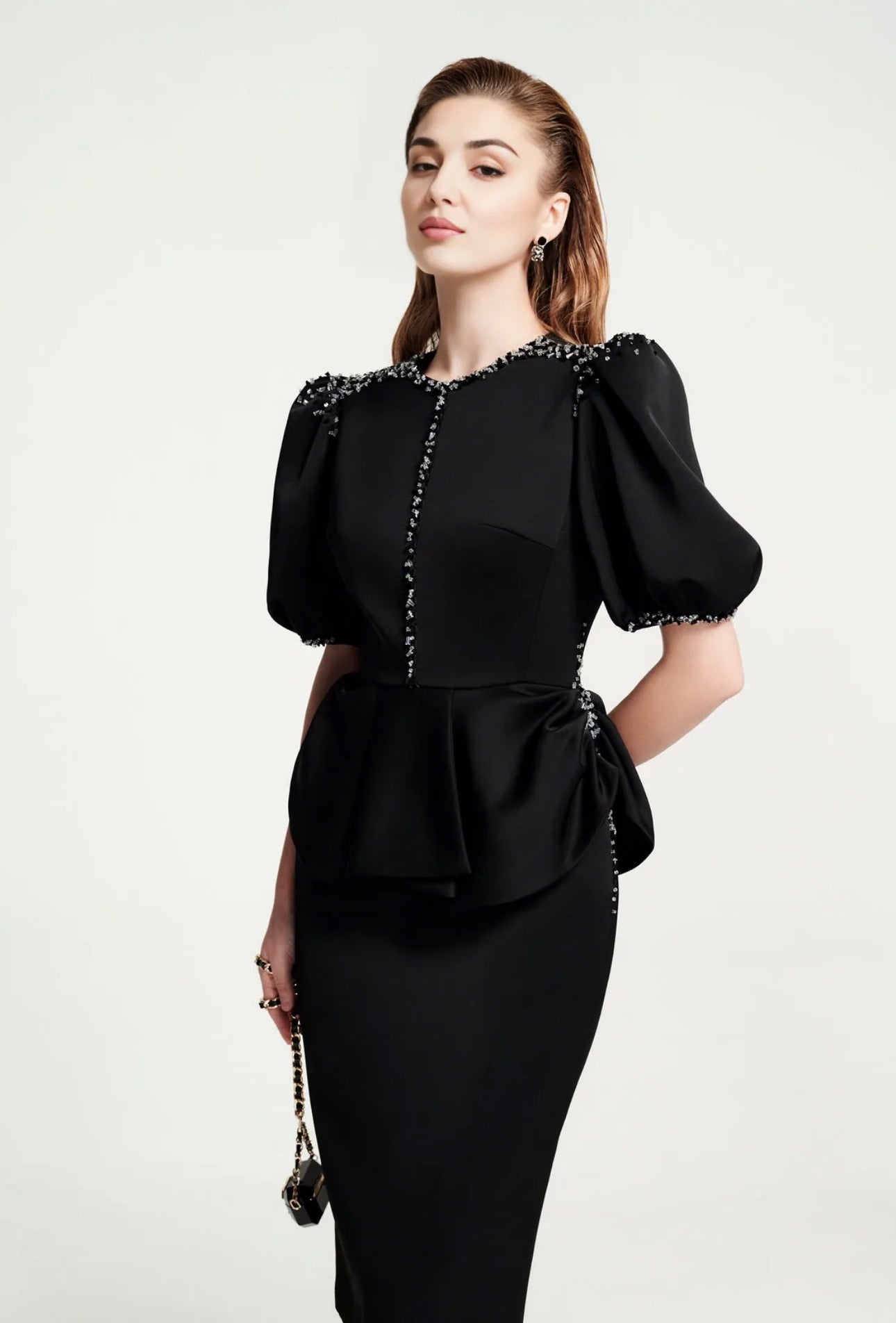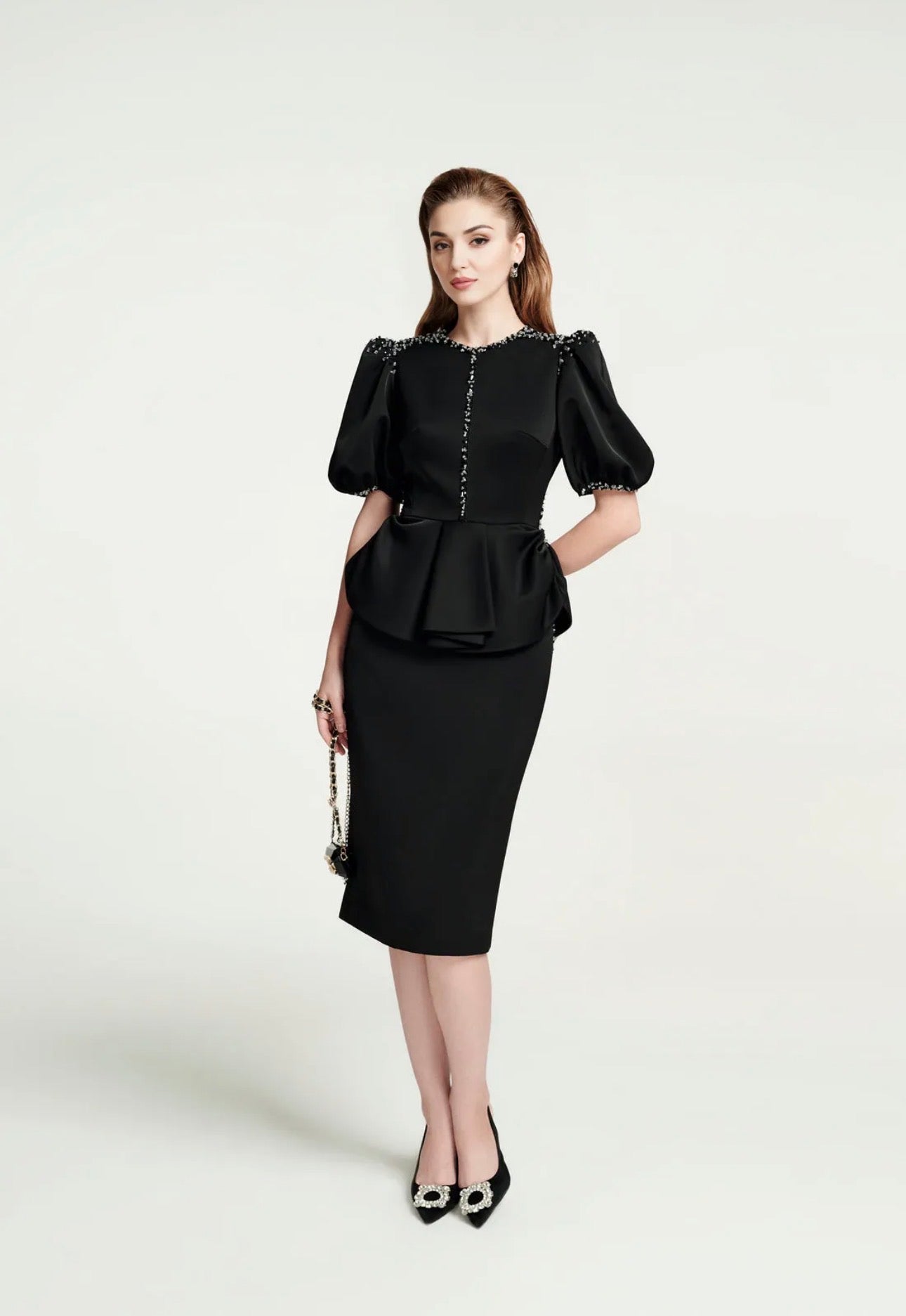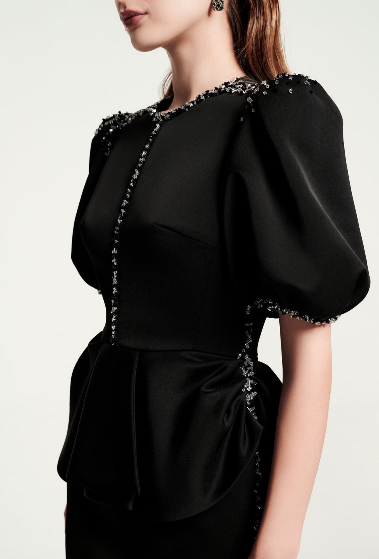 This is an elegant black two-piece suit featuring a top with dramatic puff sleeves and a wide, structured peplum waist. The round neckline and shoulder seams are heavily embellished with intricate silver beading and piping, paired with a classic pencil skirt.