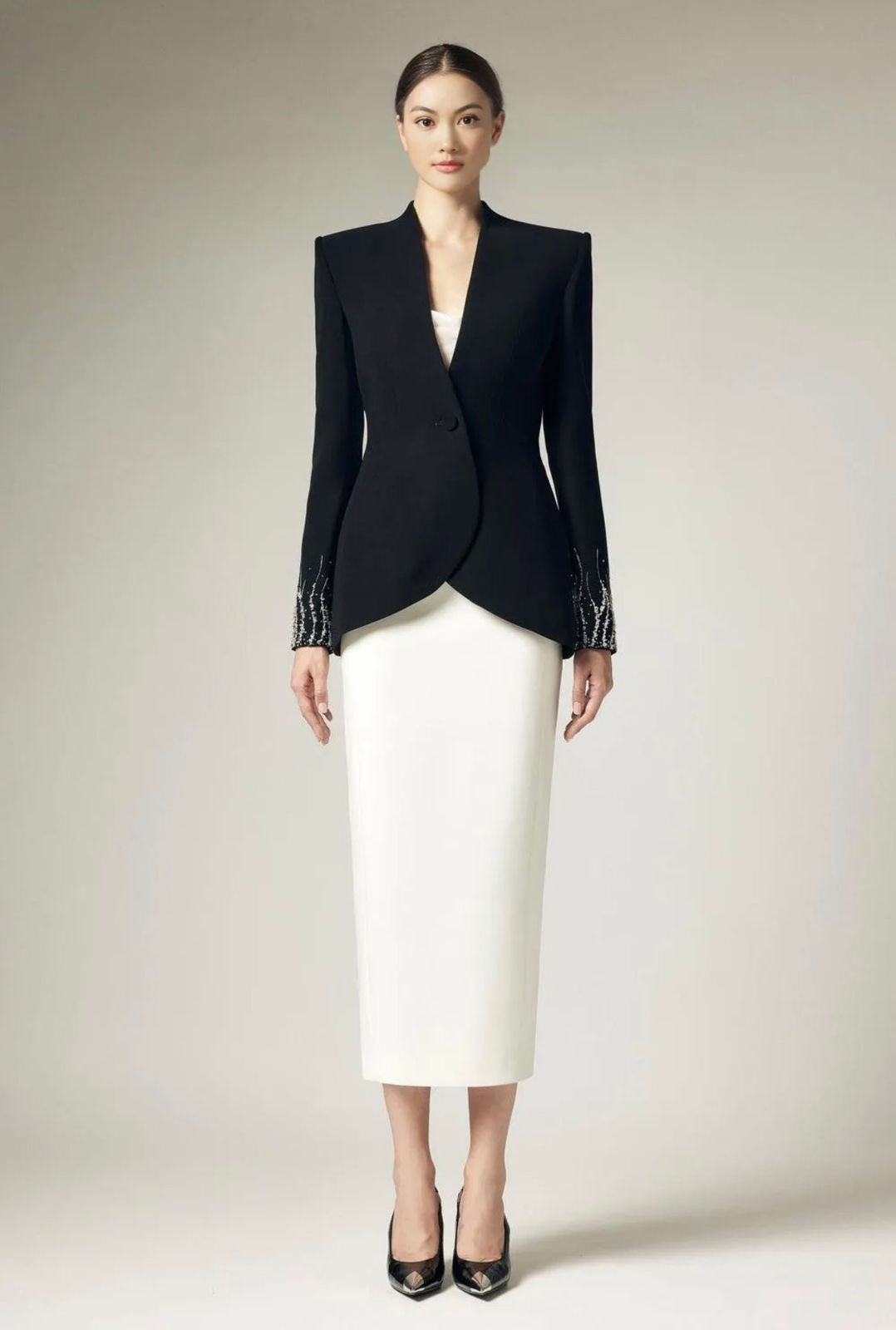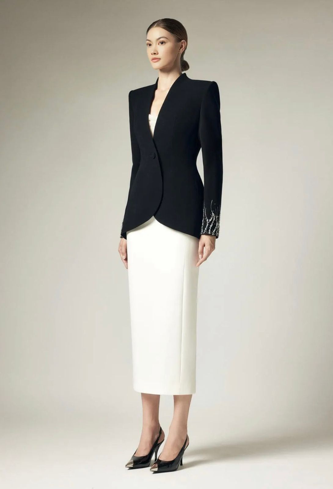 A black structured blazer featuring sharp shoulders, a single-button closure, and a curved hemline that creates a sculpted silhouette. The cuffs are delicately embellished with subtle bead or sequin detailing, adding a refined touch of sparkle. Underneath, it’s paired with a sleek, white midi-length pencil skirt that provides a striking monochrome contrast.