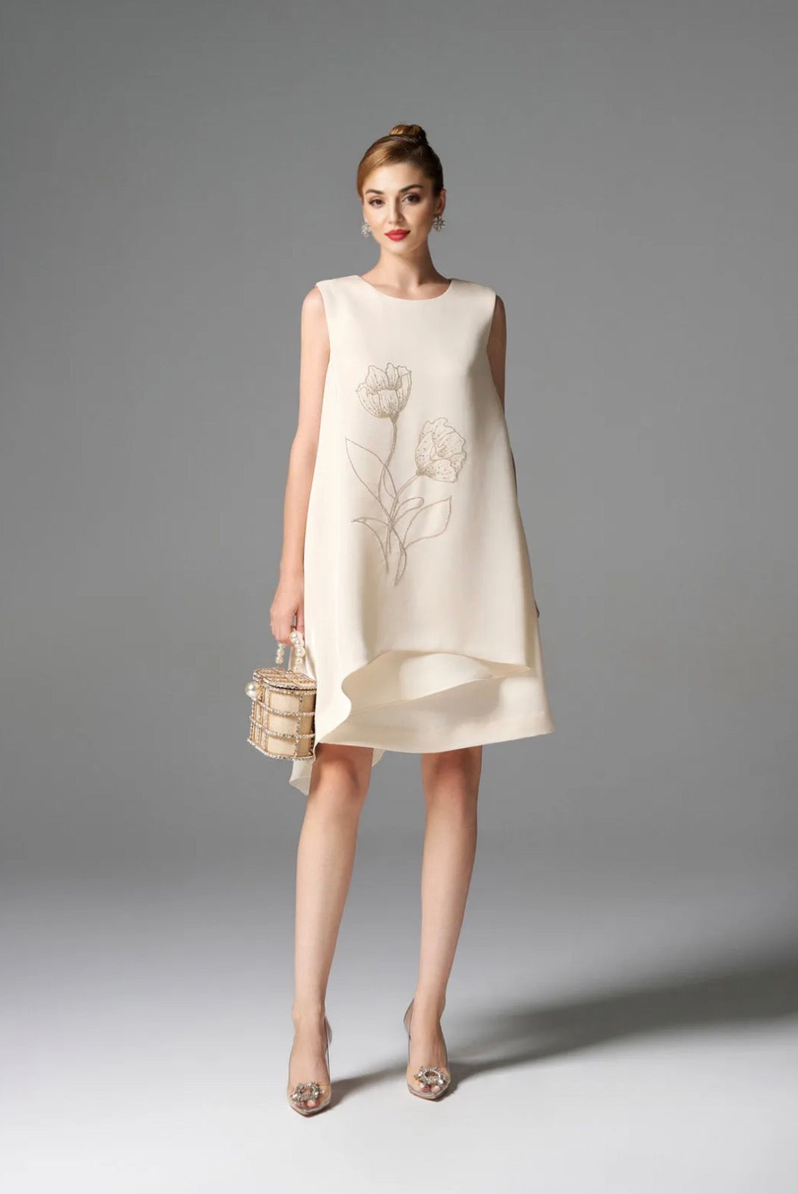 This is an airy ivory A-line shift dress with a graceful sleeveless silhouette, falling above the knee. The front is decorated with a delicate gold-toned floral line embroidery. The hem features a high-low or tiered effect, adding movement to the simple design.