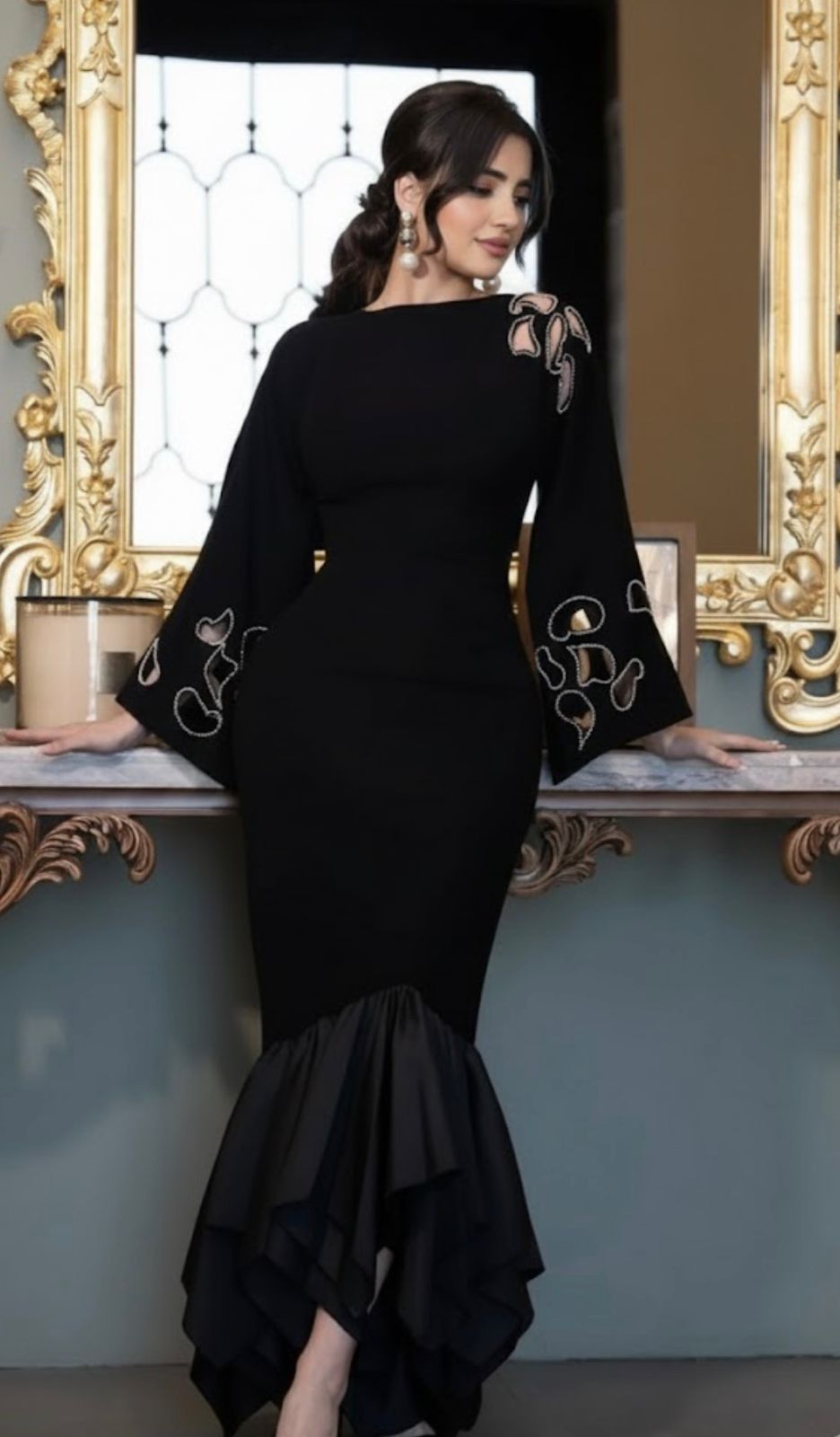 • Fit: Sculpted body-fit with flared sleeves and layered mermaid hem
