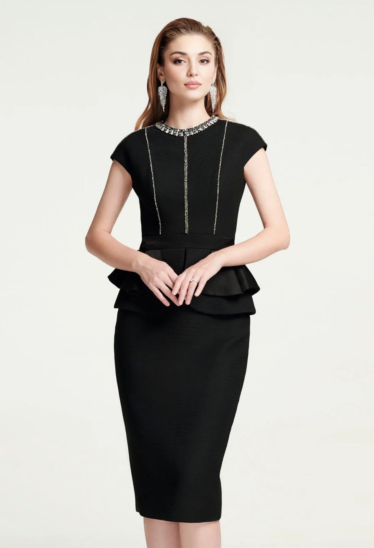 This is an elegant black two-piece outfit featuring a cap-sleeve top and a pencil skirt. The top has a sophisticated round neckline and cap sleeves, both embellished with delicate silver beading and piping. The silhouette is completed by a structured, layered peplum waist over a knee-length, fitted skirt.
