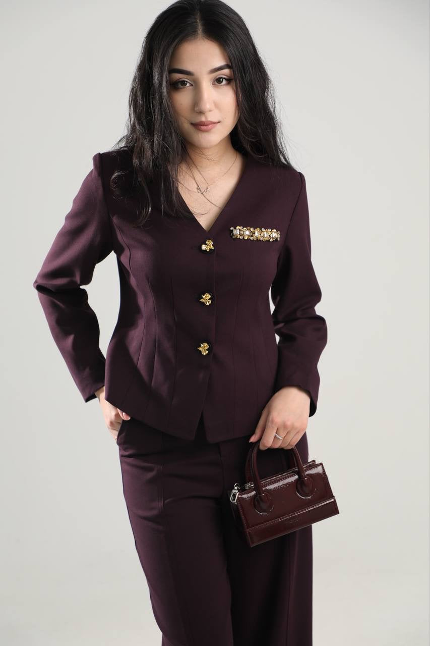 A sophisticated power set designed with a vintage-inspired peplum blazer that flares gracefully at the hip. Featuring ornate gold-tone buttons and a sparkling embellished pocket detail, the jacket is paired with tailored wide-leg trousers with front-seam detailing for a polished, professional finish.