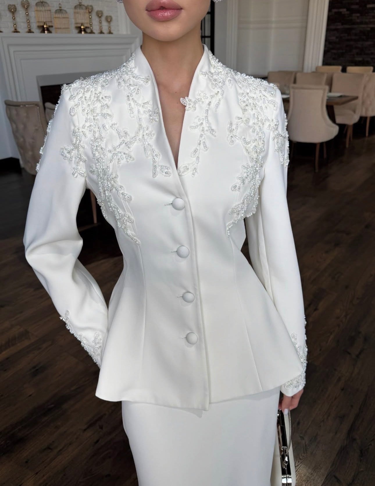 This is a refined two-piece ensemble featuring a floor-length A-line skirt and a tailored jacket with a fitted, button-front bodice and a subtle peplum detail. The jacket is distinguished by elaborate white-on-white embroidery and beading along the shoulders and high collar, creating a chic, bridal-alternative or formal evening look.