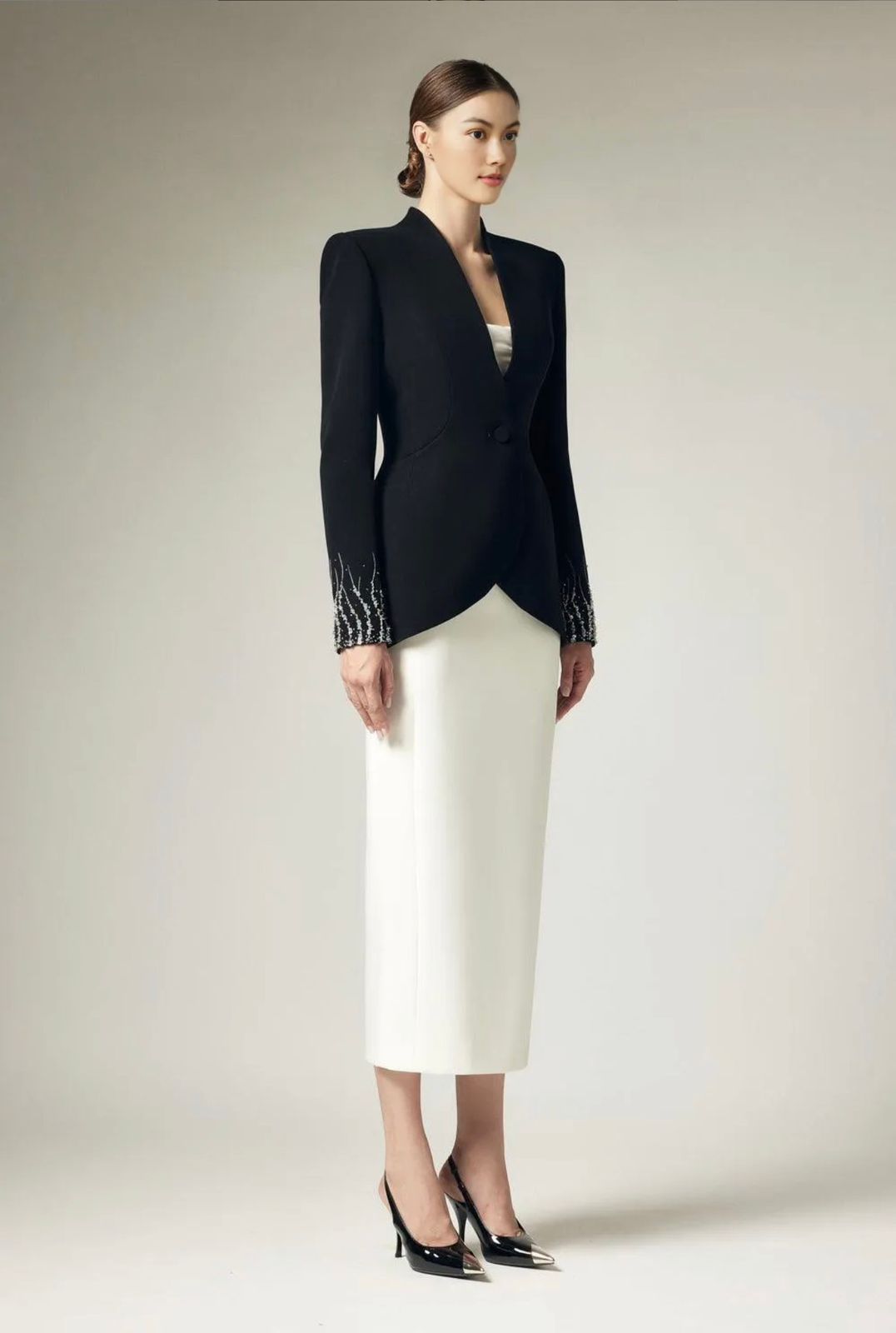 A black structured blazer featuring sharp shoulders, a single-button closure, and a curved hemline that creates a sculpted silhouette. The cuffs are delicately embellished with subtle bead or sequin detailing, adding a refined touch of sparkle. Underneath, it’s paired with a sleek, white midi-length pencil skirt that provides a striking monochrome contrast.