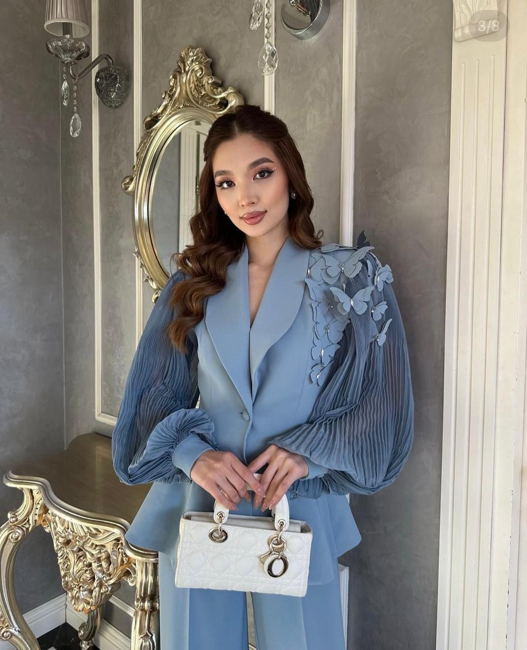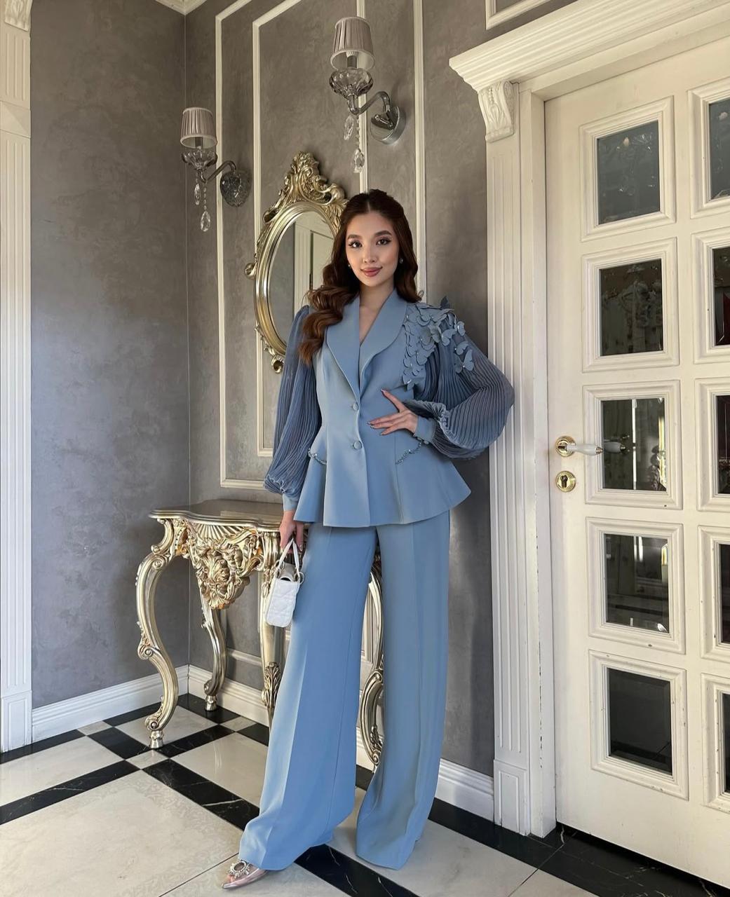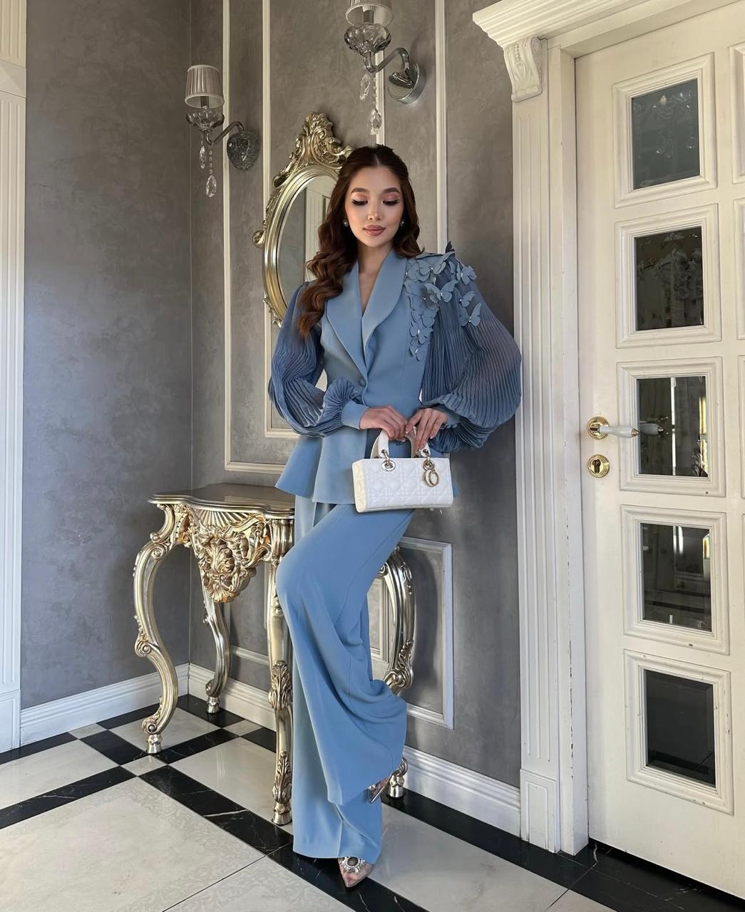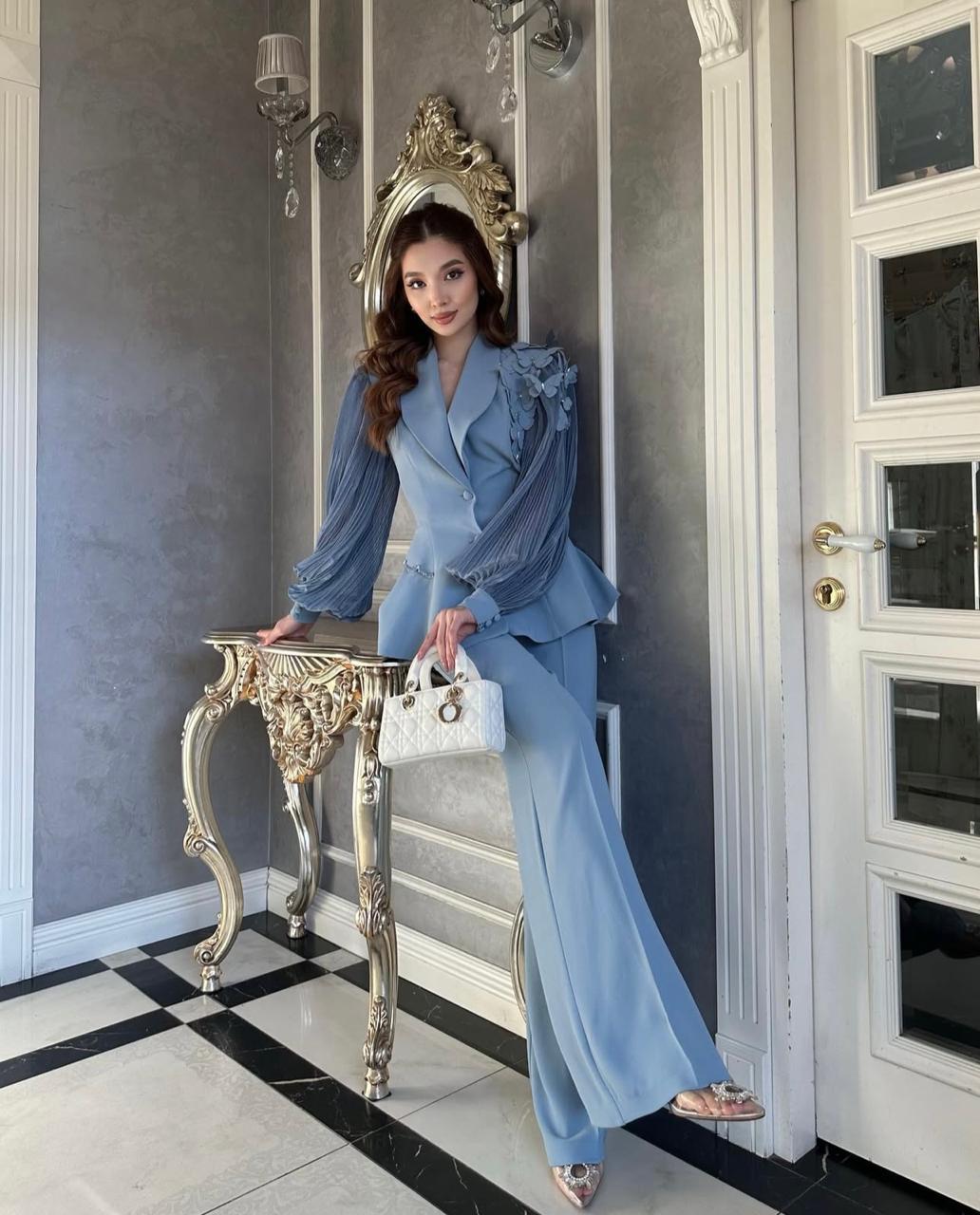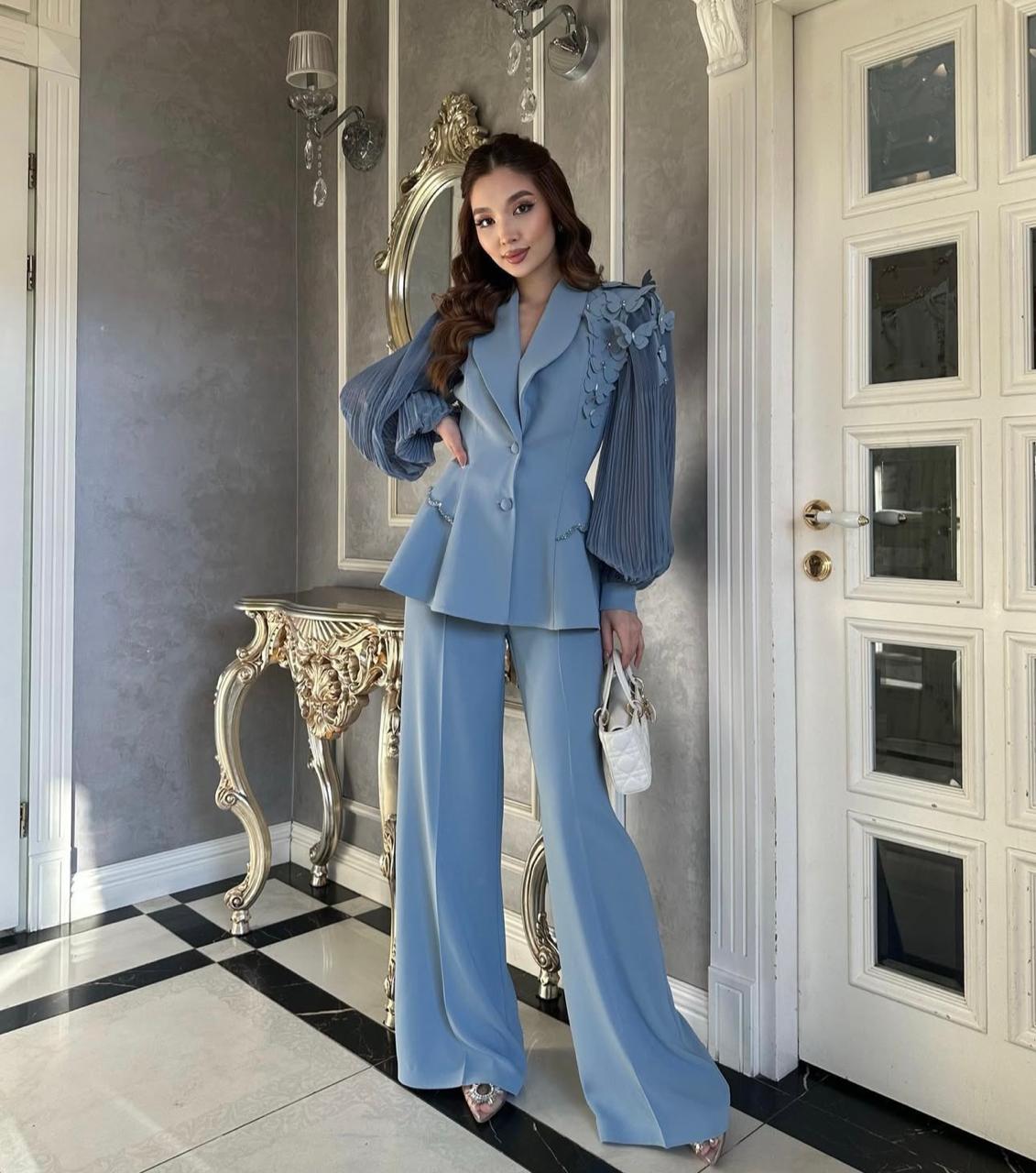 Design: The blazer features sculpted pleats, delicate floral appliqué, and a peplum waist for a romantic yet powerful silhouette. Paired with high-waisted, wide-leg trousers for a lengthening effect.