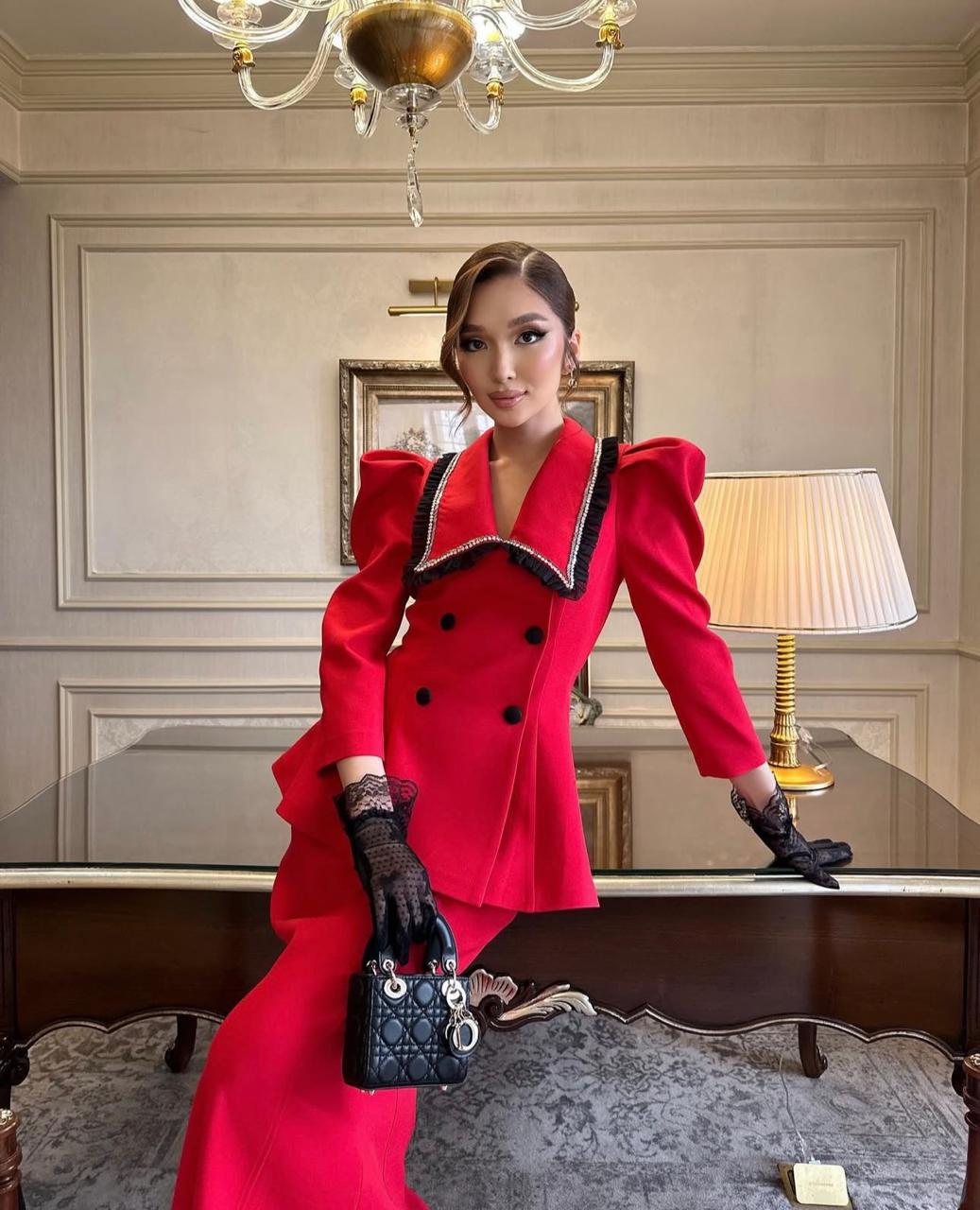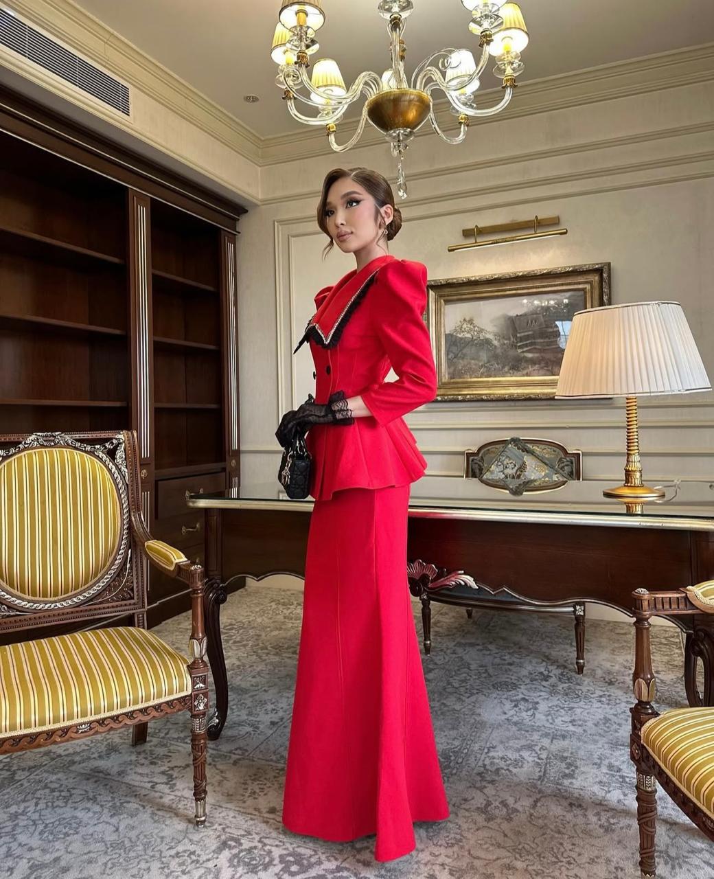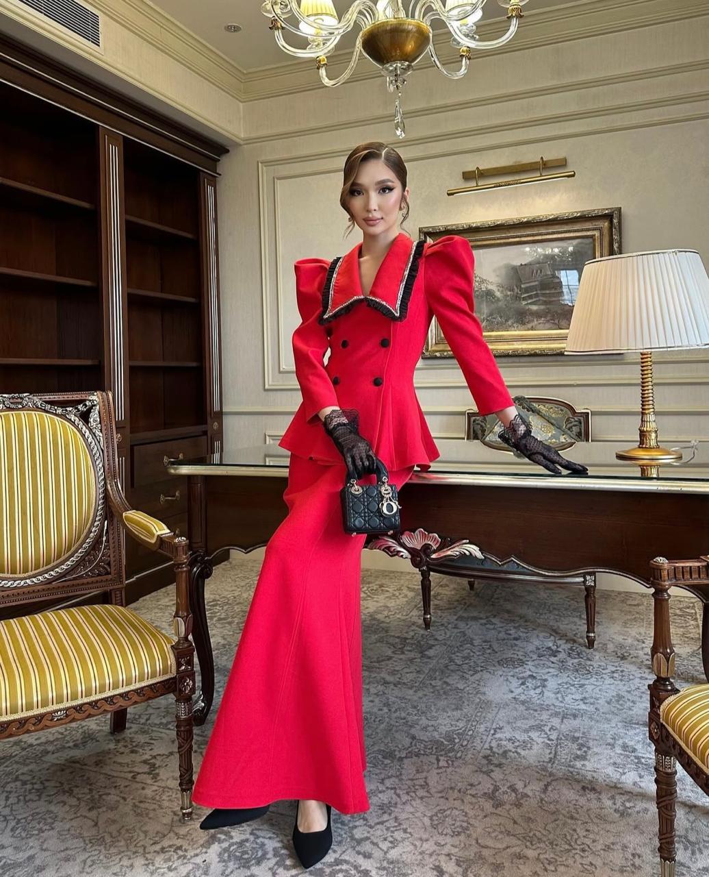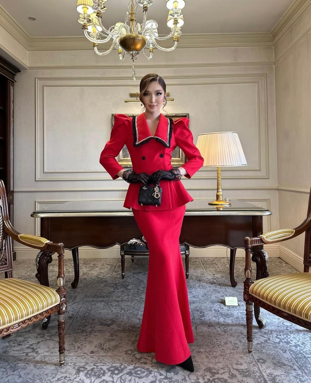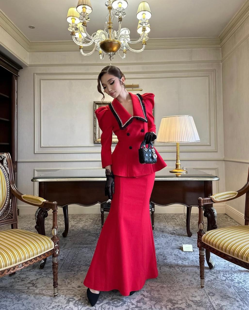 Featuring a dramatic peplum jacket with puffed sleeves and a contrasting collar, paired with a sleek, high-waisted floor-length skirt — it’s classic tailoring with a modern twist.