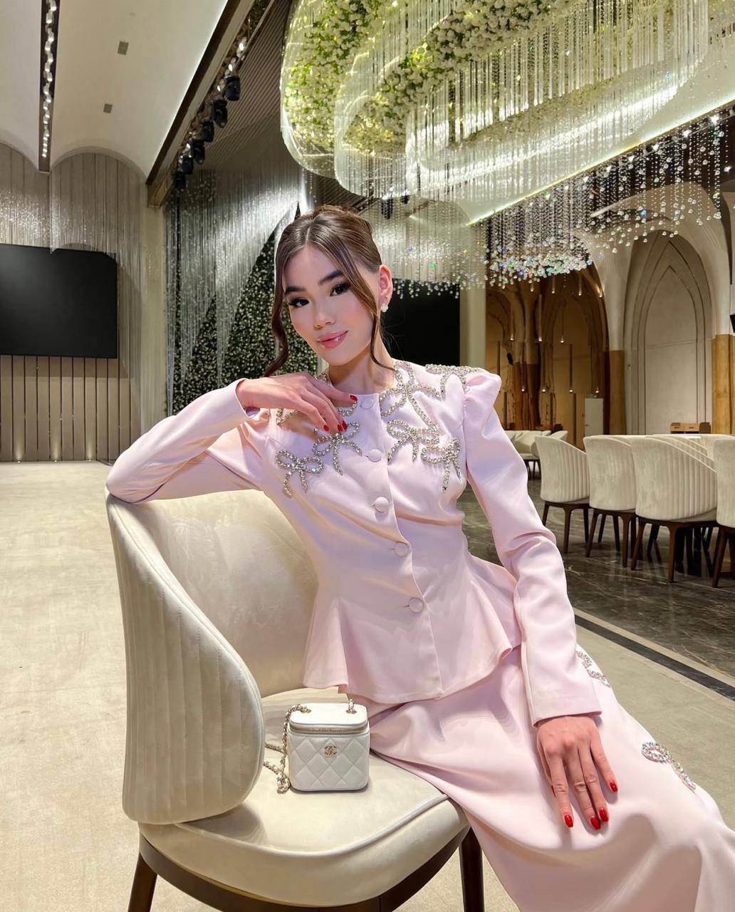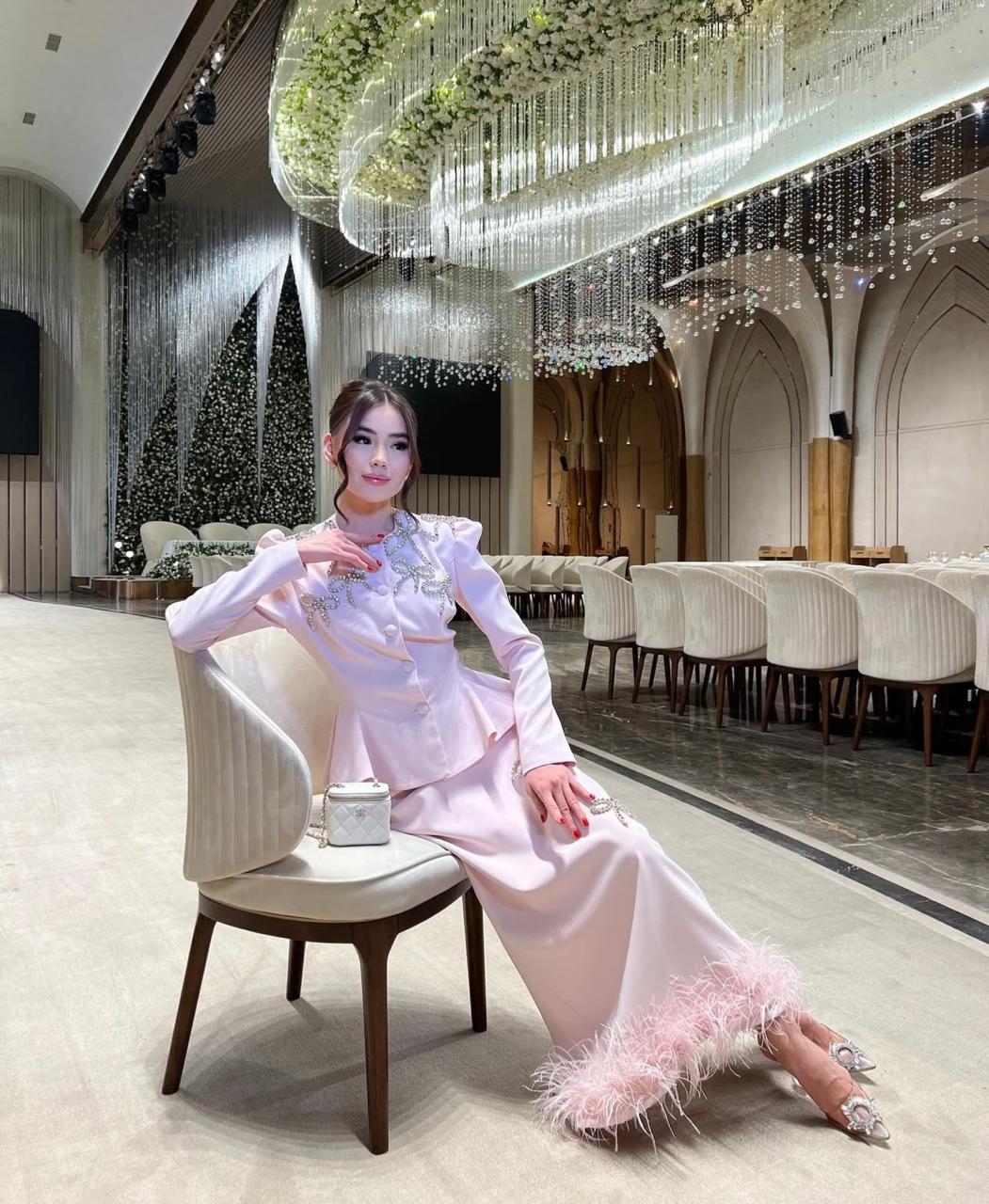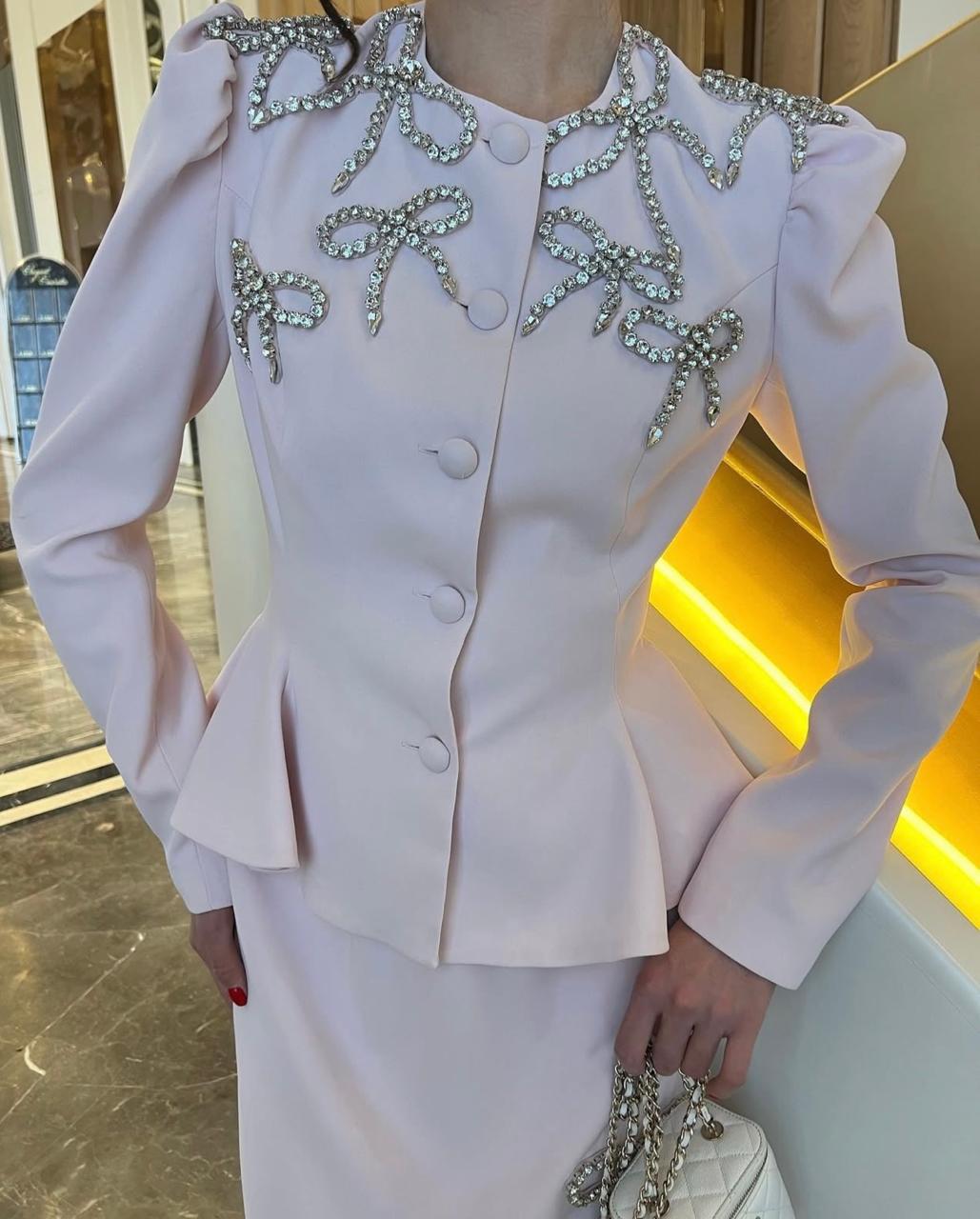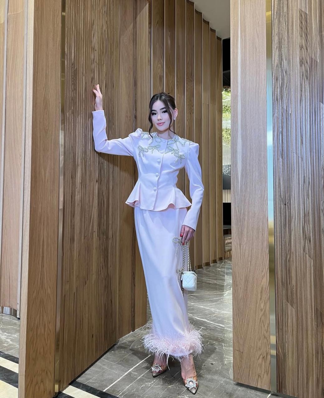 The tailored jacket sculpts the waist with a peplum flare, while the straight-cut skirt elongates the figure — an effortlessly feminine silhouette with a modern regal edge.