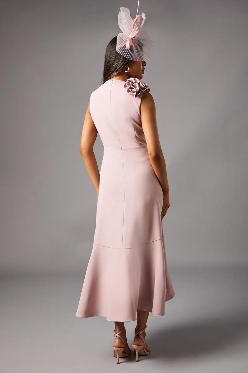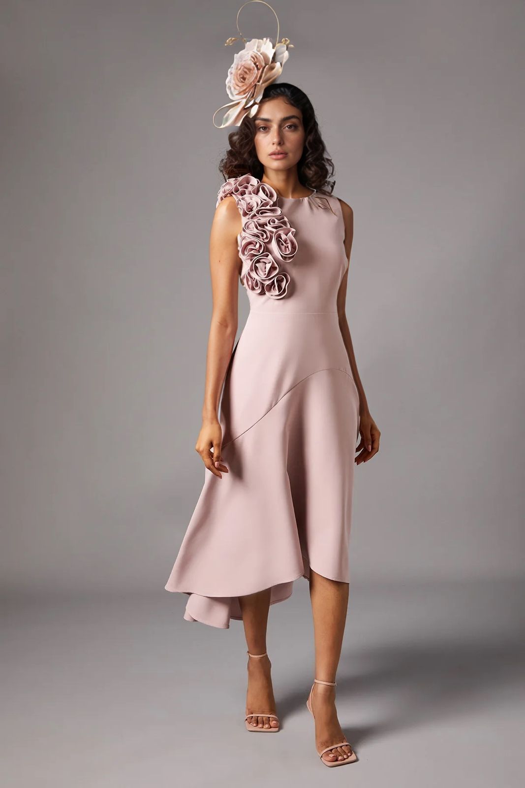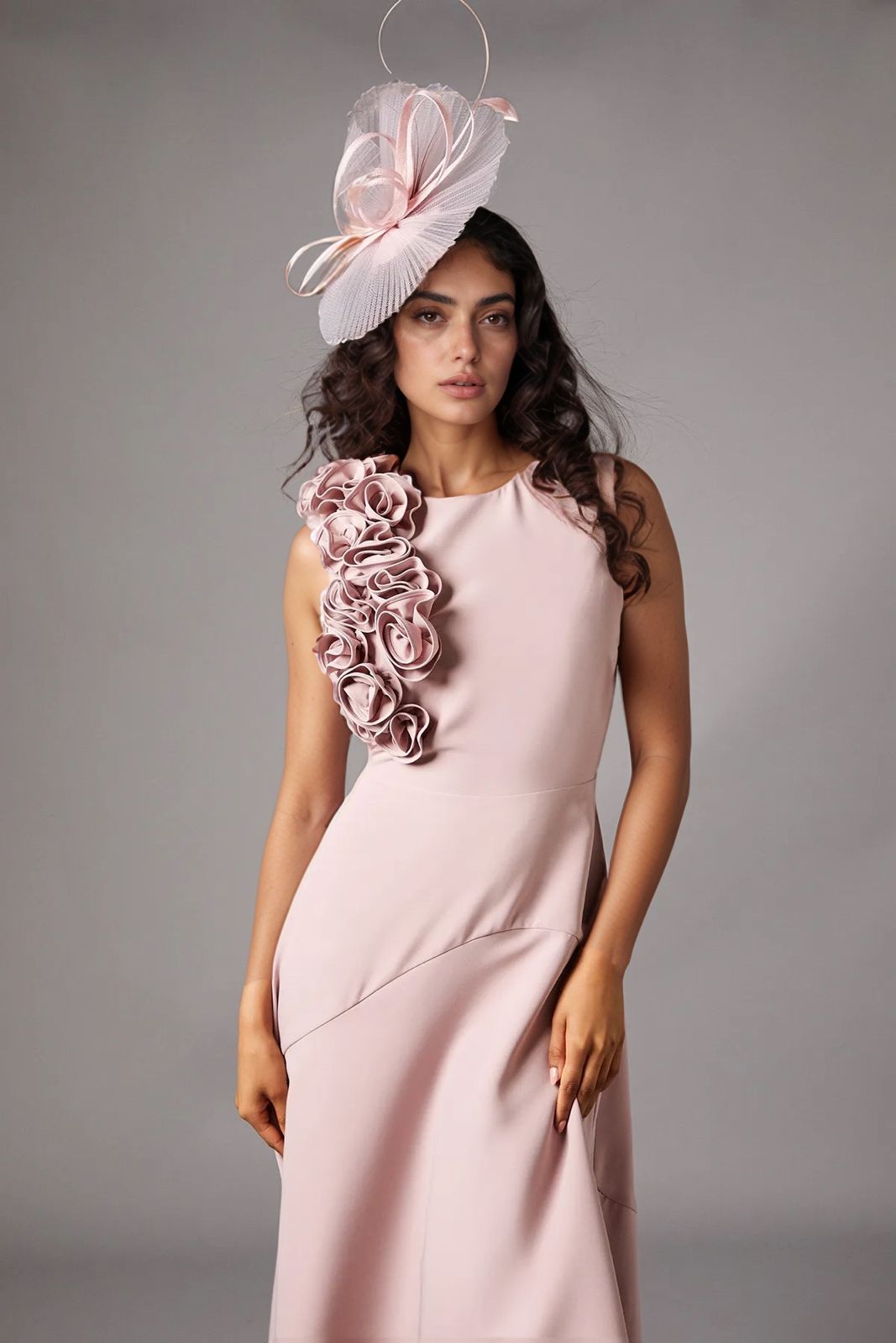 A muted blush pink, sophisticated and flattering, with floral details and a fascinator in soft, complementary tones. -