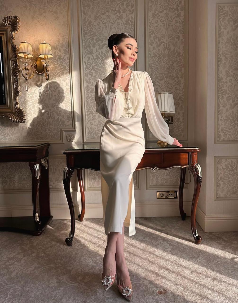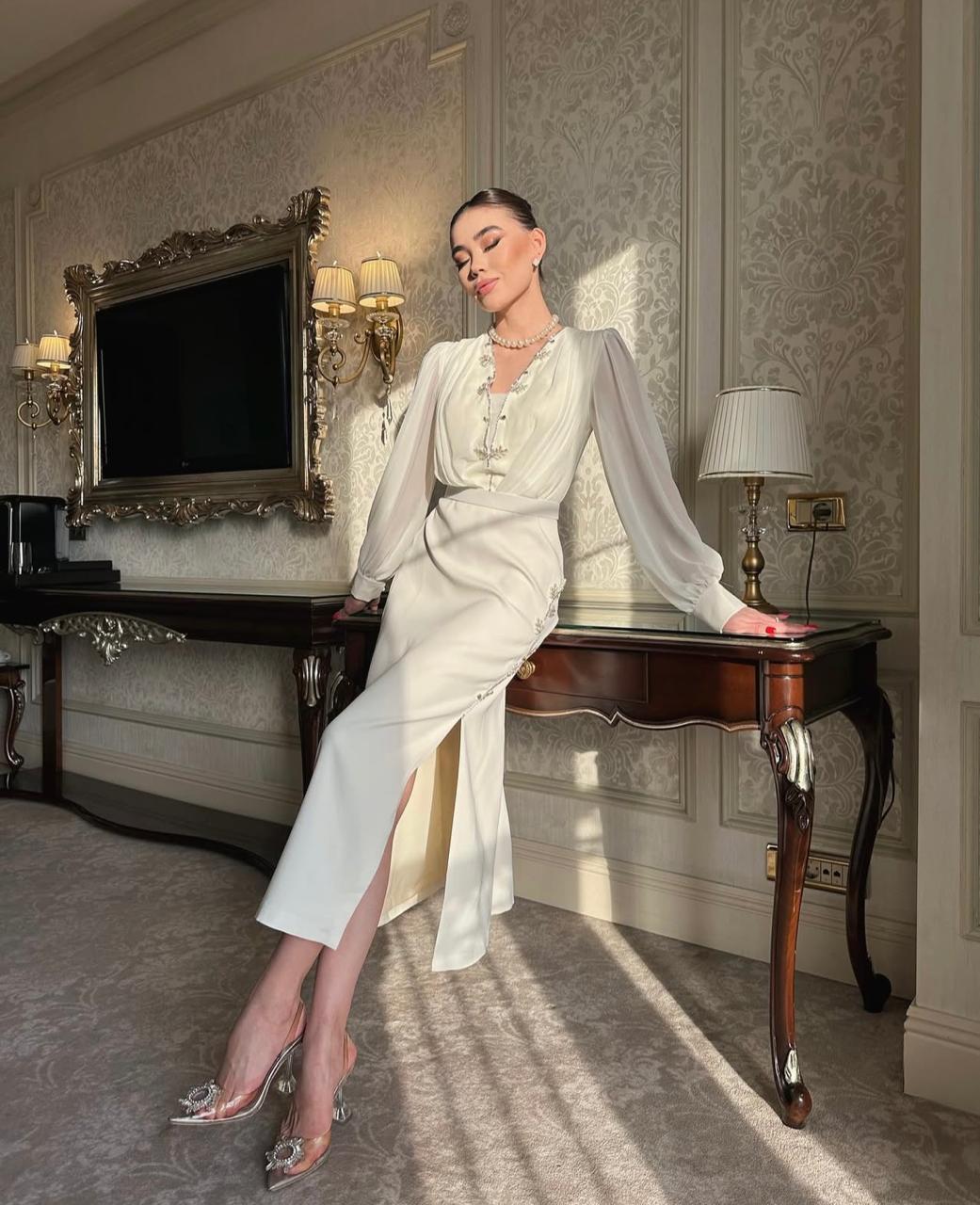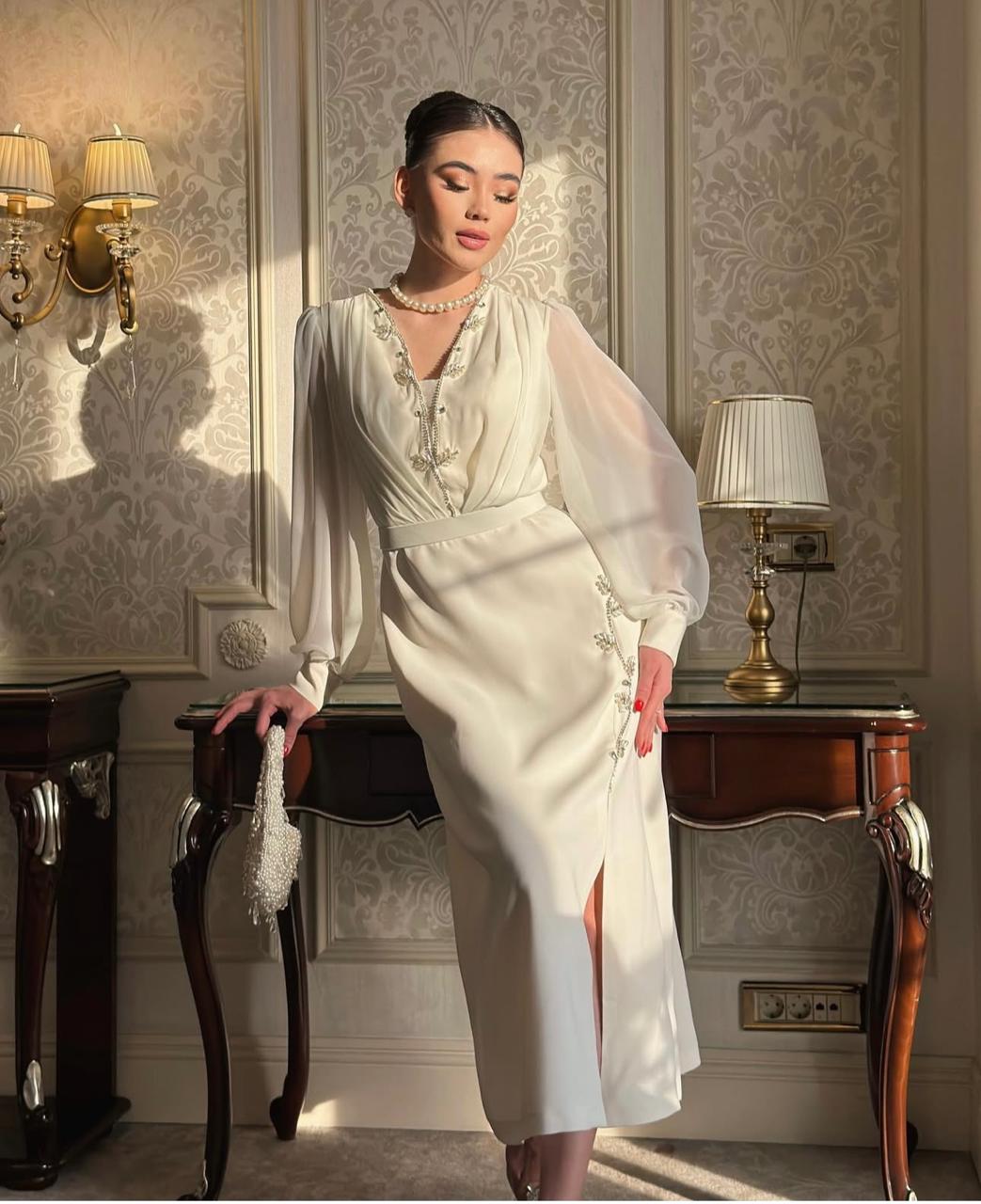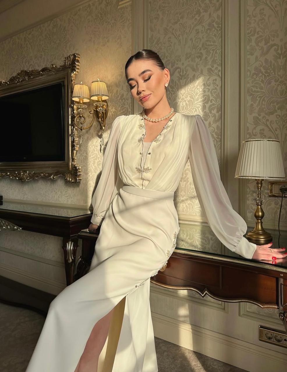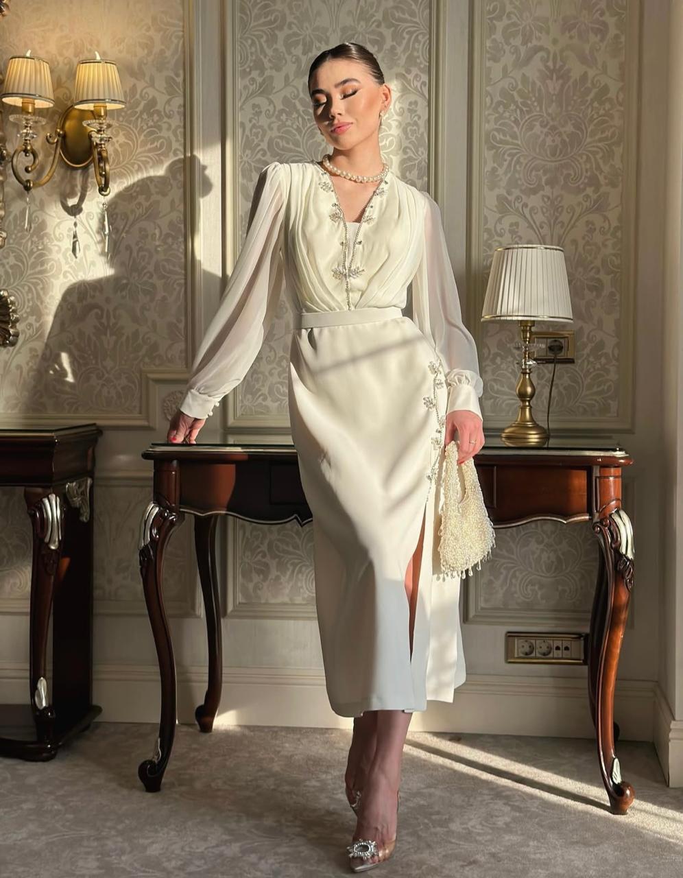 Design: Featuring hand-embellished crystal accents along the neckline and side slit, the design blends vintage charm with modern refinement. The wrap-style bodice and high slit add shape and fluidity.